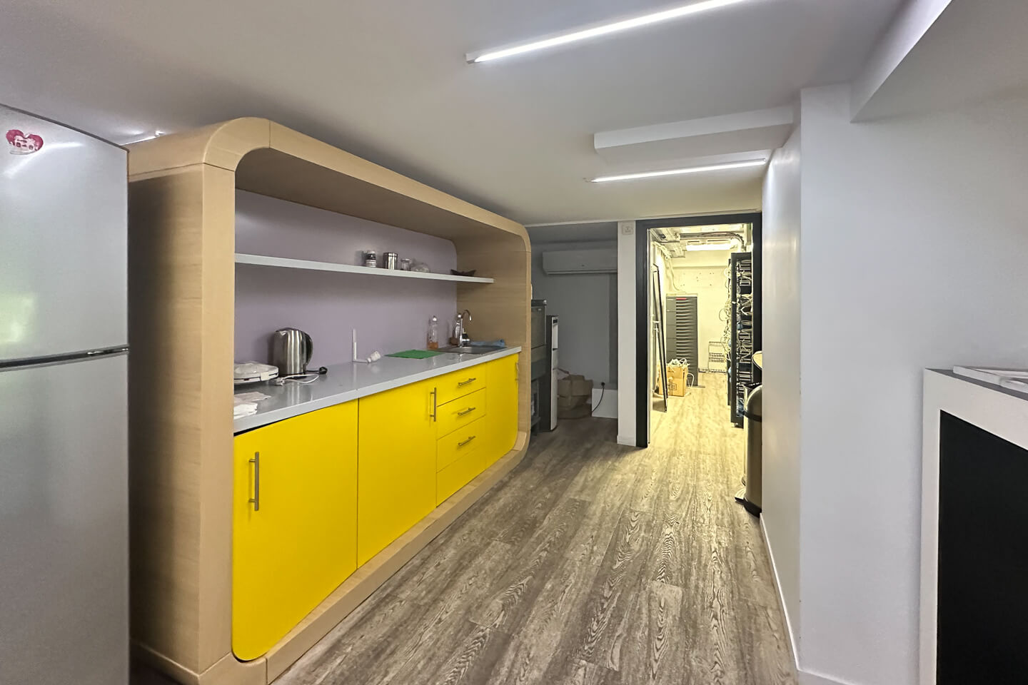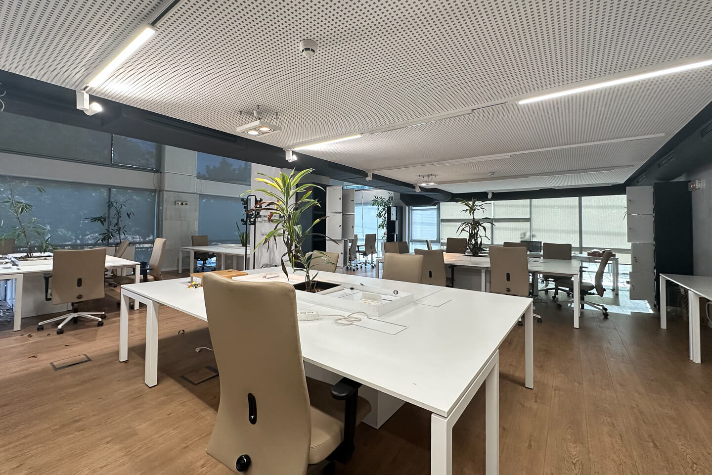 The ground floor features an open-plan layout ideal for workstations, while the mezzanine level includes stylish enclosed offices and meeting rooms. The space is equipped with laminate flooring, gypsum-board ceiling with integrated LED lighting, and movable partitions offering layout flexibility.